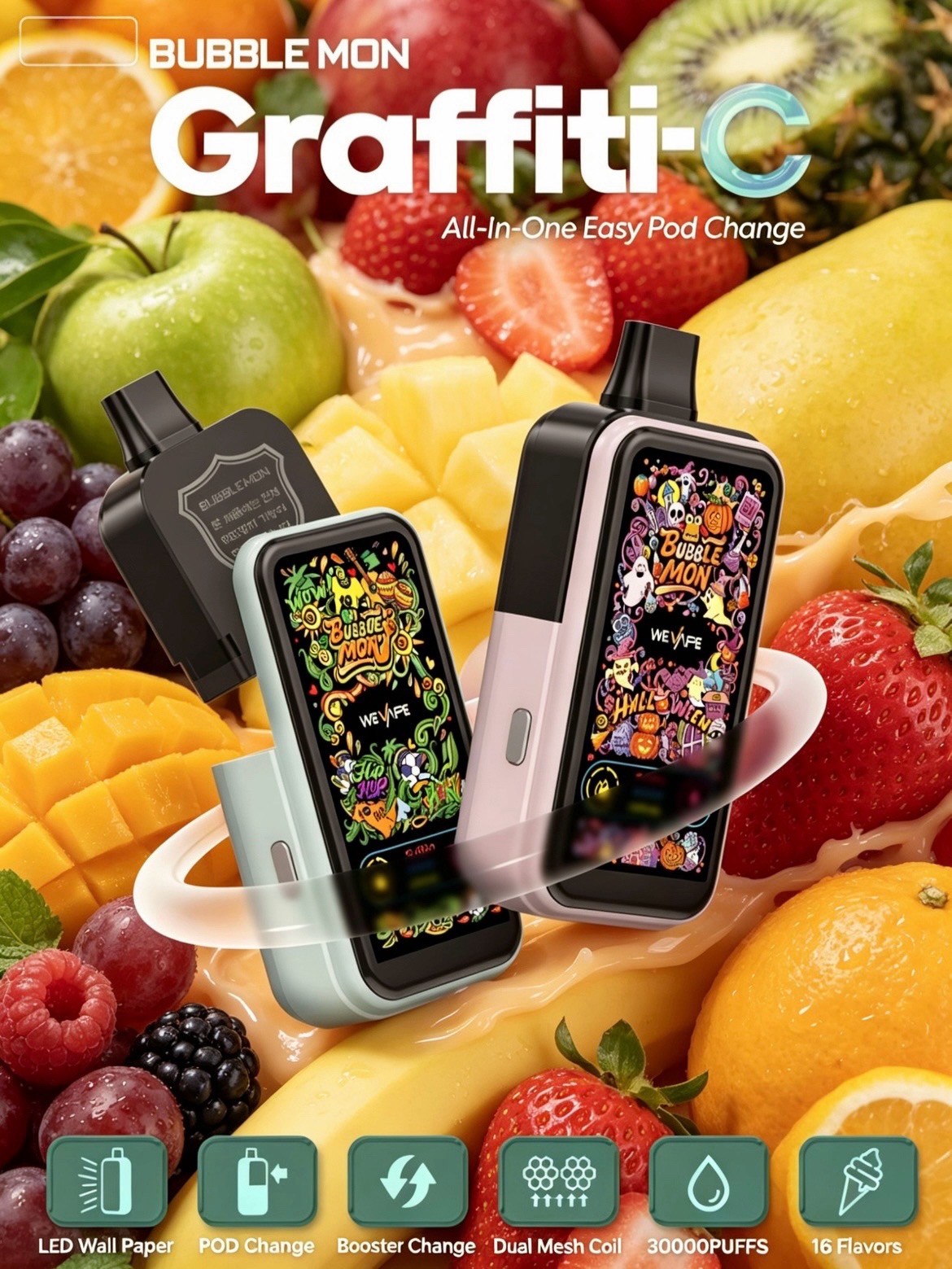 1. BUBBLEMON三代电子烟,搭载高清涂鸦LED彩屏,油量电量双显。双模式双网芯雾化,800mAh快充,马卡龙5色可选,潮流镜面机身,正品现货速发!
